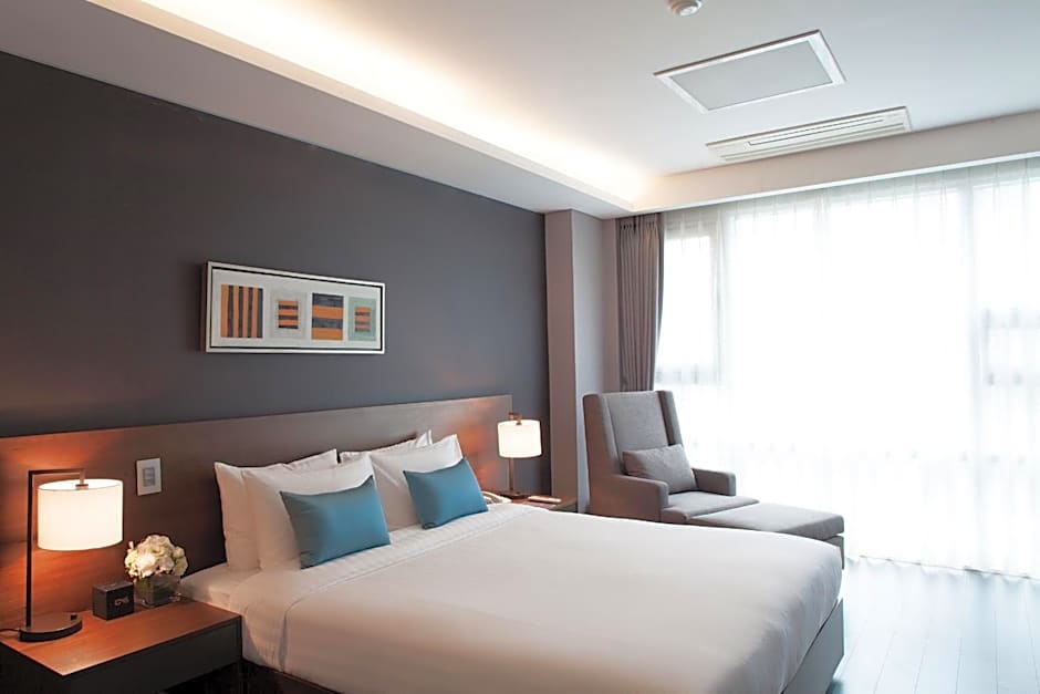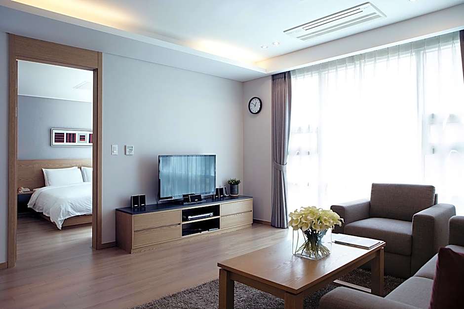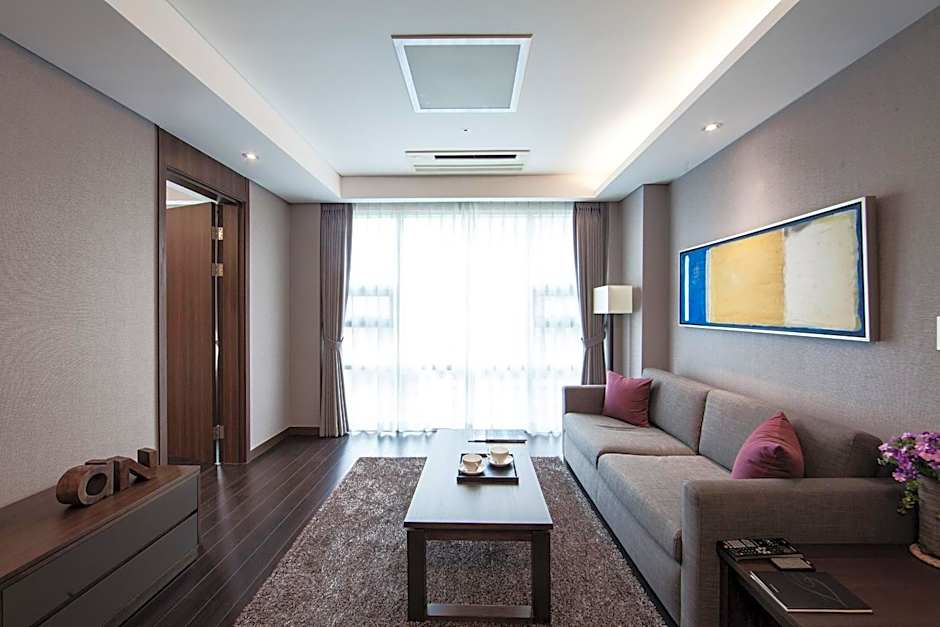 The suite features a living room and bathroom with electric bidet.